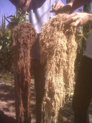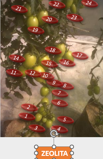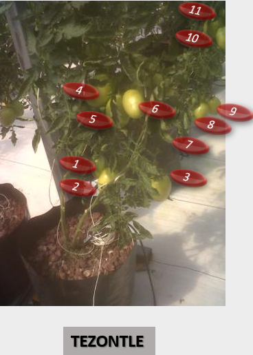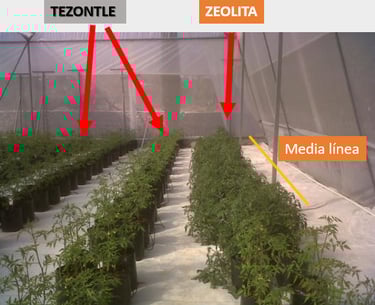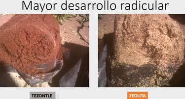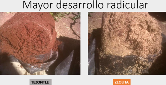 Con estas pruebas, se demostró al productor, que se generan más frutos por planta con la zeolita, que usando el sustrato de tezontle, por que se tiene mayor presencia de nutrientes, que eso genera un mayor tallo y por ende la posibilidad de desarrollar y soportar mayor peso de productos, se ahorra en consumo de agua, ya que la zeolita es capaz de soportar hasta un 60% de su peso en agua, se hidrata y deshidrata otorgando a la planta el líquido como lo requiera, a diferencia del tezontle que no retiene la humedad; estas características, entre otros beneficios de la zeolita, permiten un mayor desarrollo radicular como se ve en las imágenes inferiores.