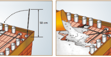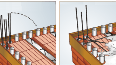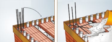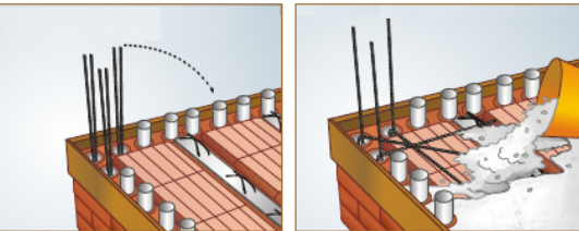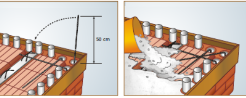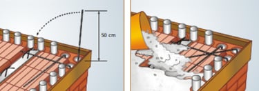 Si la obra se usa un techo y/o cubierta con losa; las barras de acero de la columna pueden superar 50 cm más allá de la altura de trabajo, y deberán ser dobladas en ángulo de 90° en la losa. A continuación, la losa se llena con hormigón que cubre las barras de acero.