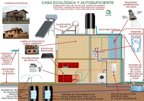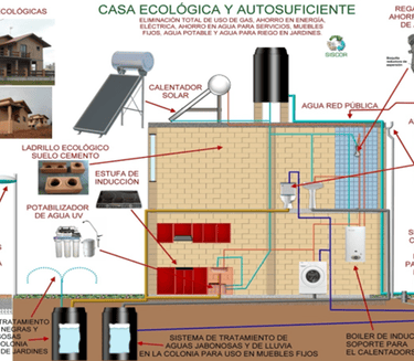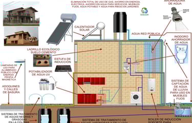 Integra además calentadores solares y sistemas de respaldo por inducción magnética, sistemas de captación y filtrado de agua de lluvia, captación y tratamiento de aguas jabonosas para reuso en servicios de baño, captación y tratamiento de aguas negras para riego de jardines, integran equipos de ahorro de agua en escusados lavabos y regaderas; e incluso equipos de generación y potabilización de agua, así como equipos de iluminación y calentamiento de alimentos eléctricos, eliminando una buena parte de la generación de gases efecto invernadero que se producen en una casa. Una casa que elimina los drenajes, ya que todos los líquidos de descarga se tratan y reutilizan para servicios o para riego, reincorporando los líquidos al manto freático completamente limpios.