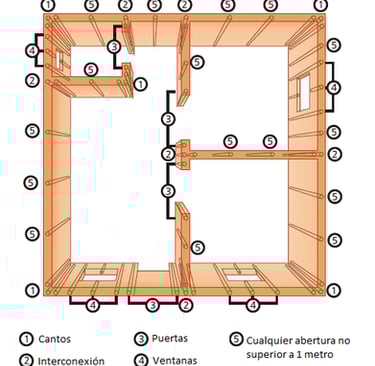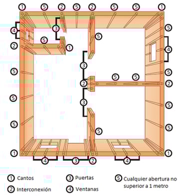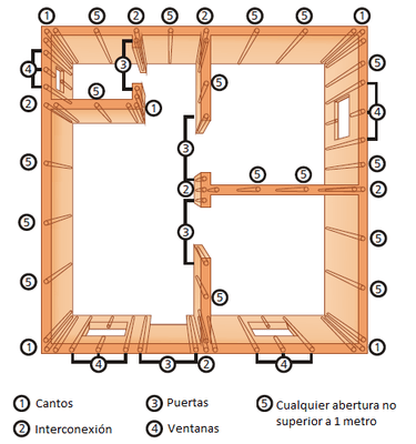 Además de las correas de amarre, las aberturas, puertas y ventanas son reforzadas con columnas laterales. Además de puertas y ventanas, también se recomiendan la distribución de columnas a lo largo de la construcción.Para facilitar la distribución de las columnas en el trabajo, se recomienda siguiendo un orden como en el ejemplo: