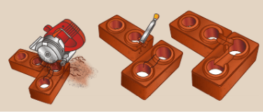 Con la ayuda de una sierra circular, hacemos pequeñas ranuras en ladrillos, suficientes para incrustar las abrazaderas que se unirán el columnas entre sí.Cada 50 cm de pared erigida, la interconexión de las columnas por grapas, es la garantía de una mayor estabilidad en la obra.